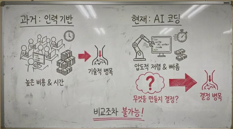 구현이 너무나 쉬워지고 저렴해진 덕분에 역설적으로 새로운 병목 현상이 발생했습니다. 과거에는 기획안을 코드로 옮기는 과정이 가장 힘들었지만, 이제는 무엇을 만들 것인가를 결정하는 제품 관리 단계가 가장 어렵고 중요한 지점이 되었습니다. 실리콘 밸리의 인력 구성 비율이 급격히 변하고 있는 이유도 여기에 있습니다. 과거 PM 한 명이 8명의 엔지니어를 담당하던 시대에서 이제는 1:1 비율, 혹은 그 이상의 기획 역량이 요구되는 시대로 접어들었습니다.