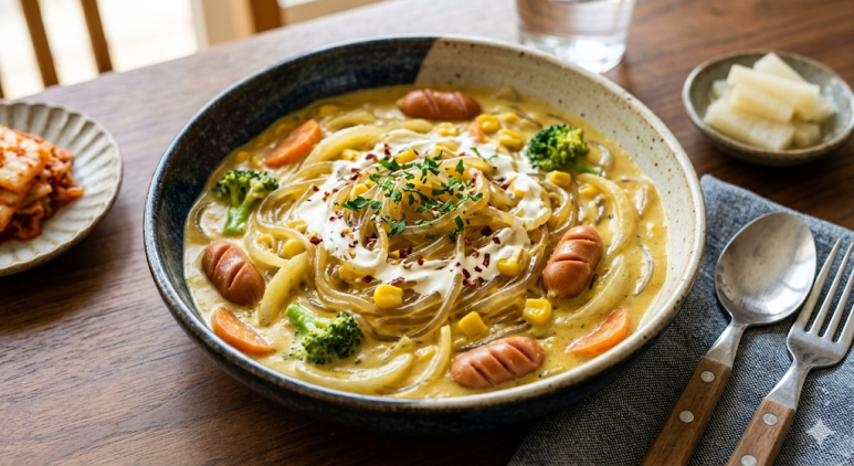 - 당면이 부드럽게 익으면 체다치즈 1장을 올려 녹이고, 마지막으로 파슬리 가루를 뿌려 완성합니다.