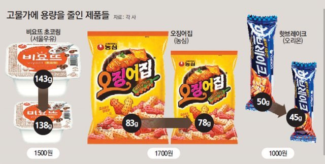 치킨 중량 감소, 과자 및 초콜릿 양 줄이기 등