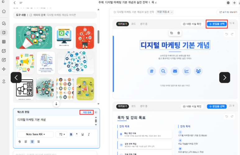 AI 편집 버튼을 통해 레이아웃 수정, 아이콘 변경, 콘텐츠 교차 검증 가능