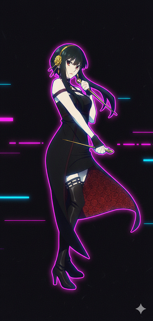 영문 프롬프트 예시: pop art style, glowing neon pink and blue outlines, dark background, vibrant synthwave aesthetic, high contrast, sharp details.