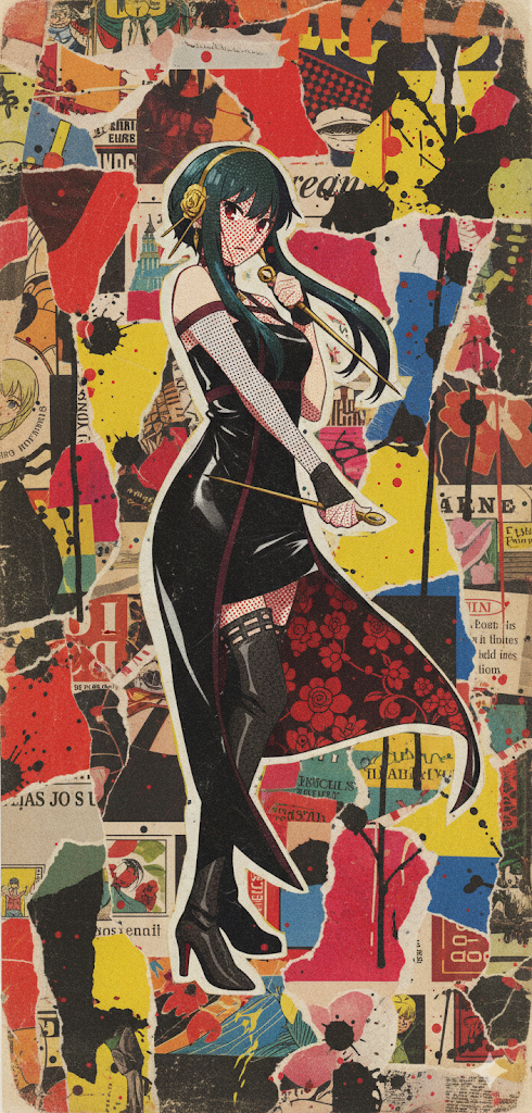 영문 프롬프트 예시: mixed media art style, torn magazine pieces, various patterns and textures, vibrant and artistic, vintage scrapbook feel.